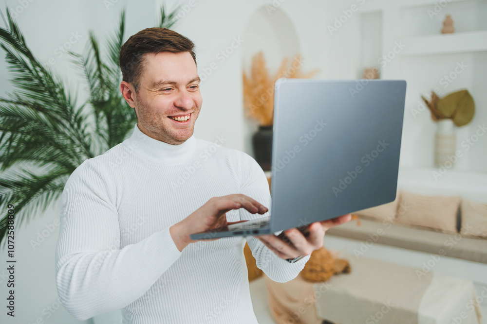A man in a white sweater is working on a laptop at home. male freelancer works online remotely.