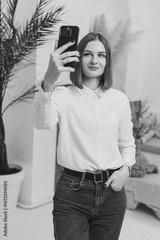A young pretty woman in a white shirt is talking on the phone and working online. A woman works remotely in a bright room at home.