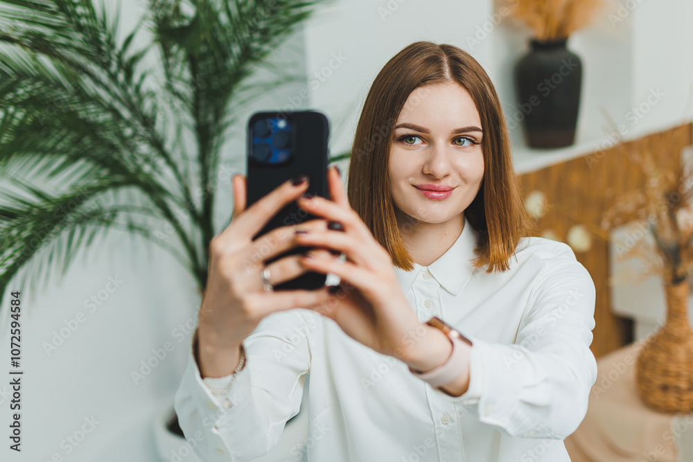 A young pretty woman in a white shirt is talking on the phone and working online. A woman works remotely in a bright room at home.