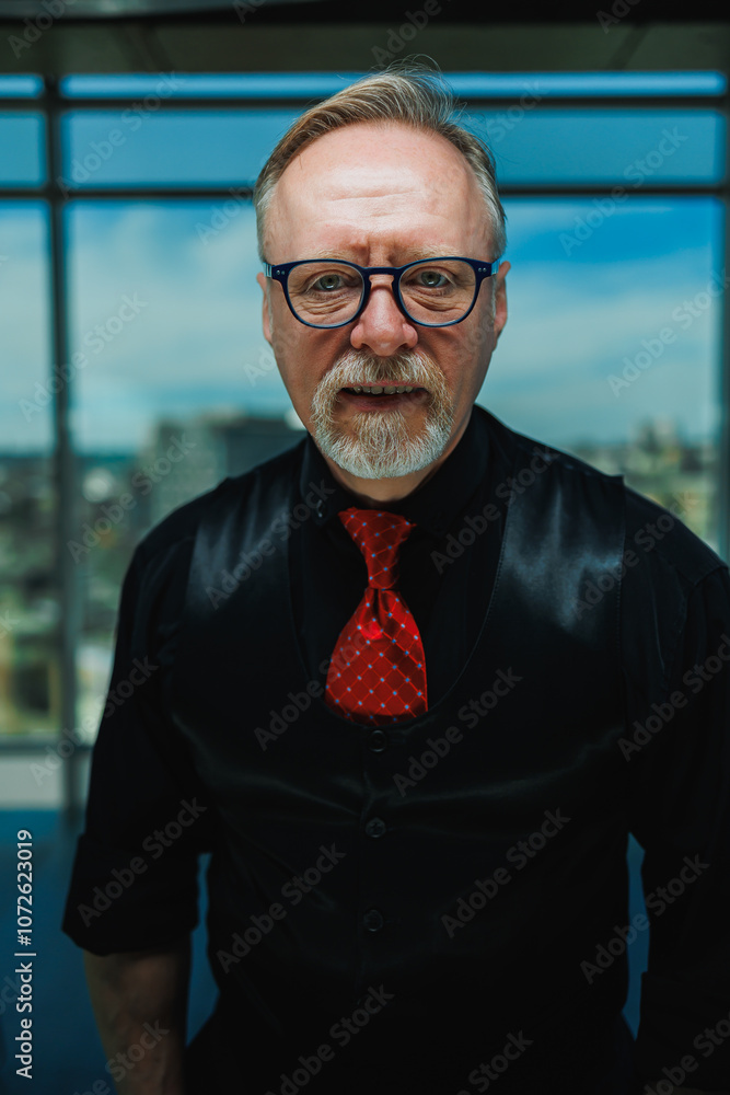 Bearded old man grimacing in glasses. The old grandfather's roof is falling and he grimaces.