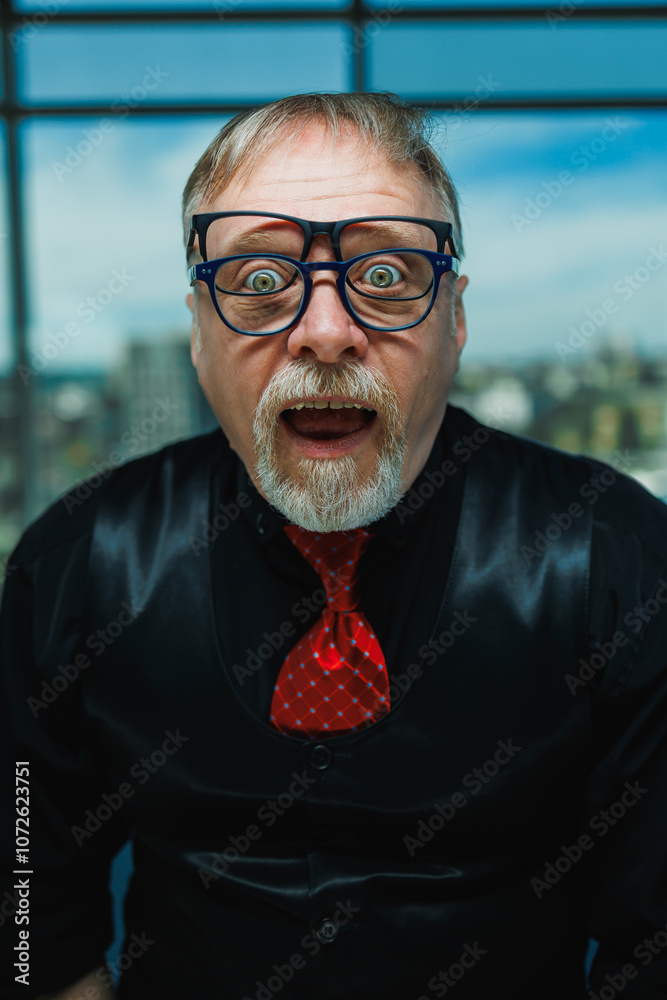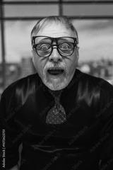 Bearded old man grimacing in glasses. The old grandfather's roof is falling and he grimaces.