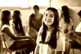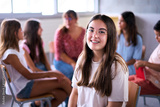 Portrait nerd Caucasian primary girl student sitting in class with classmates in background. Group children gathered in circle in study room. Elementary school female poses looking happy at camera