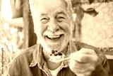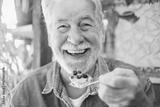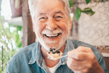 Close up portrait of happy bearded senior man eating a fruit cake in coffee shop enjoying break or breakfast and looking at camera
