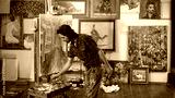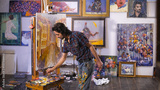 Inspiration. Colorful professional artist paints with oil. Workshop