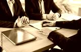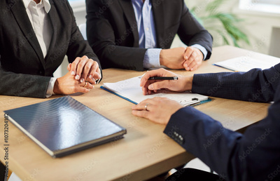 Close up of couple sitting at desk having consultation with man realtor or financial advisor in office. Insurance agent consulting man and woman in office going to sign a business contract.