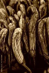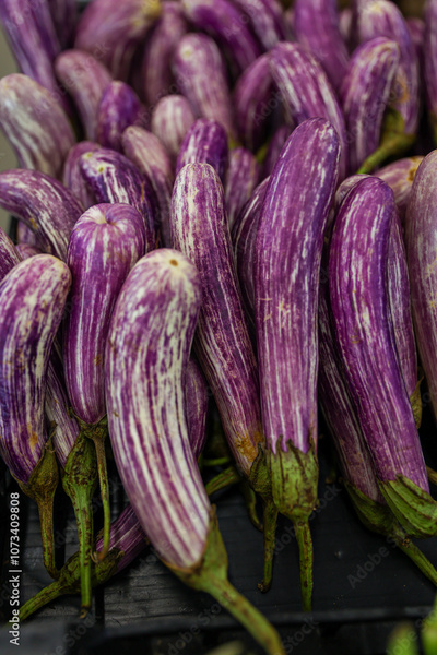 Striped purple eggplants at the market. Eggplant background