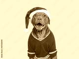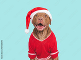 Merry Christmas and Happy New Year. Charming dog, festive costume and space for greeting inscription. Closeup, indoors. Studio shot. Congratulations for family, friends, colleagues. Pets care concept