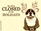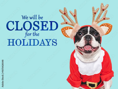 Signboard with the inscription We will be closed for the Holidays. Cute puppy and text for the sign. Closeup, indoors. Studio shot. Pets care concept
