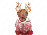 Merry Christmas and Happy New Year. Charming dog, festive costume and space for greeting inscription. Closeup, indoors. Studio shot. Congratulations for family, friends, colleagues. Pet care concept