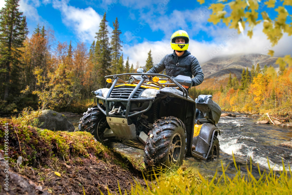 Motorcyclist on quad bike. Extreme racing in forest. Man rides ATV off-road. ATV racer in autumn mountains. Quad cyclist in yellow helmet. Driver of quad bike crosses river. ATV near stormy river.