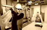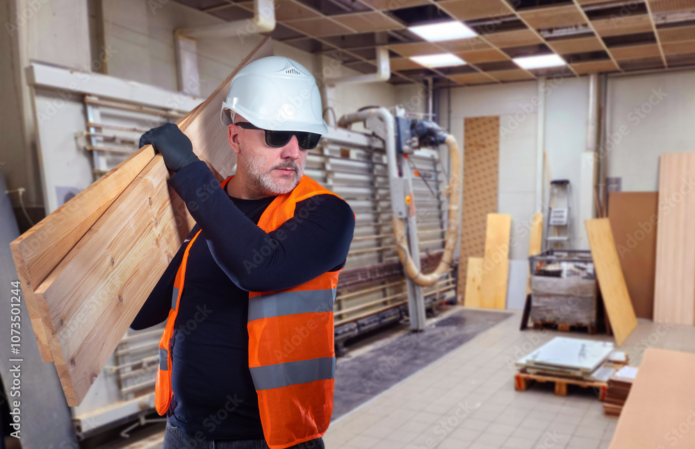 Man furniture production worker. Guy with board in carpentry shop. Man carpenter in helmet and sunglasses. Owner of furniture production. Successful carpenter at work. Furniture maker career