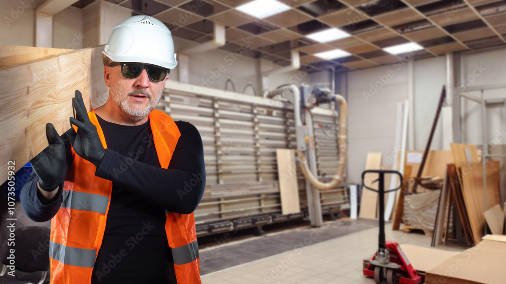 Man furniture maker. Portrait worker with boards in hands. Furniture shop employee. Worker in orange vest stands in carpentry shop. Man works at furniture factory. Carpenter carries board on shoulder