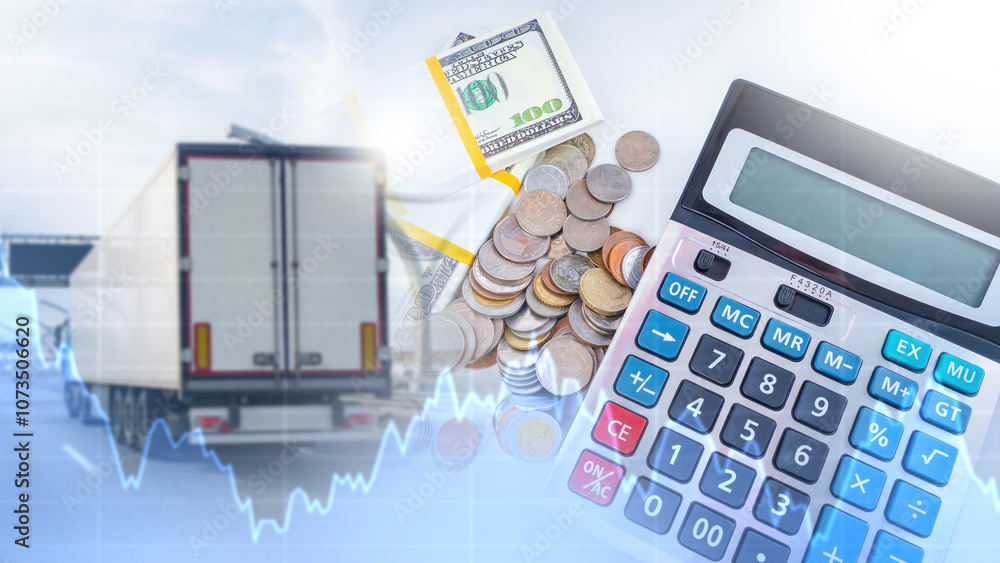 Logistics financing. Truck for transporting cargo. Calculator and money on logistics background. Graph of price fluctuations for logistics. Changes in prices for transporting goods by truck