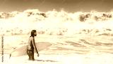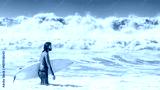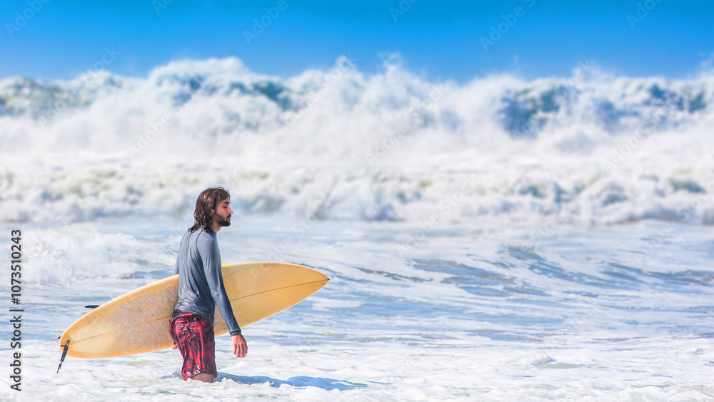 Man surfer stands in water. Guy with surfboard. Surfer against background of waves. Man walks into ocean. Tourist came to sea. Surfer with long hair. Person enjoys surfing at sea. Sport, extreme