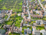 Drone view of a modern but established British housing estate. To the left, a large parcel of green field land.