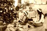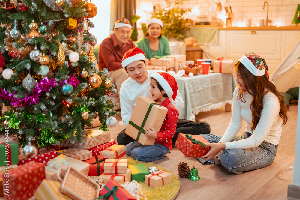 christmas, family, parenthood, enjoying, celebrate, present, celebration, gift box, laughing, parents. A family is gathered around a Christmas tree, with a young girl holding a present.