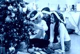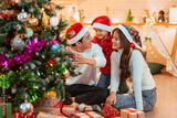 merry christmas, christmas, family, entertainment, celebrate, xmas, present, celebration, happy, childhood. A family of three, are sitting on the floor in front of a Christmas tree.