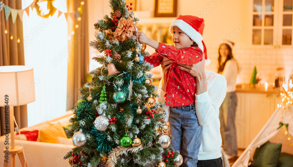 merry christmas, celebration, parent, family, celebrate, present, gift, christmas, parents, enjoying. A woman is helping a child put a bow on a Christmas tree. The scene is warm and festive.