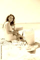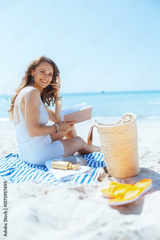 happy modern woman on seacoast with straw bag and book