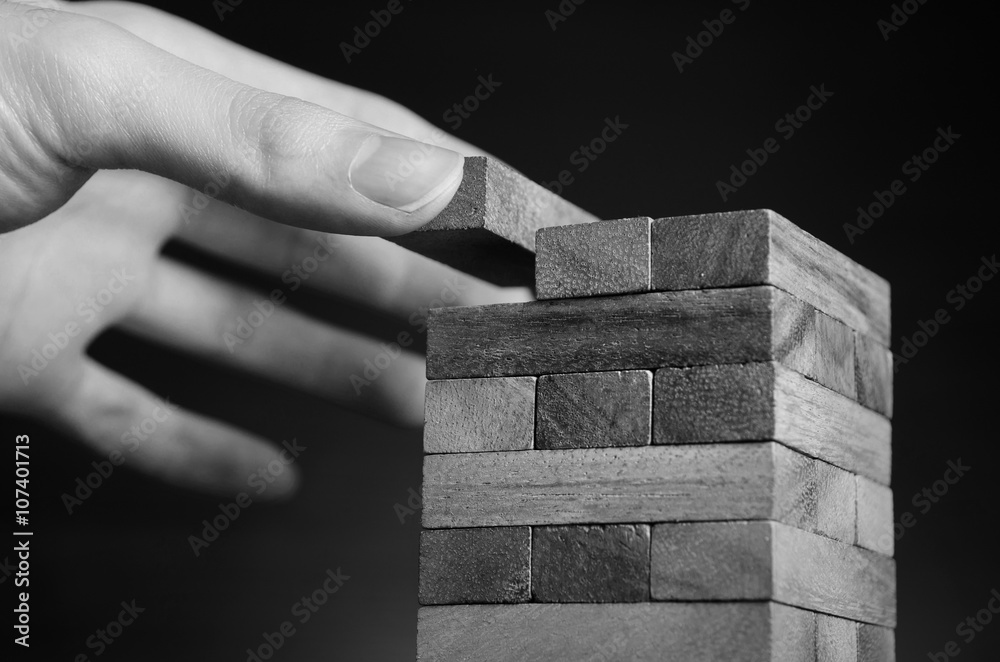 Risk and strategy, planning, Close up hand gambling placing wooden block on a tower. black and white color.