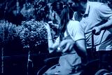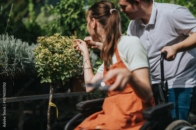 A male with Down syndrome and a female in a wheelchair engage in gardening, highlighting inclusion and joy in nature. They attentively examine plants in a lush green environment.