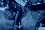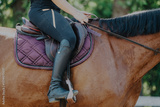 A close-up of a rider in equestrian gear sitting on a brown horse with a quilted saddle pad, highlighting the details of horseback riding equipment.