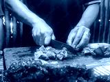 Description: A person is cutting a large piece of meat on a cutting board.