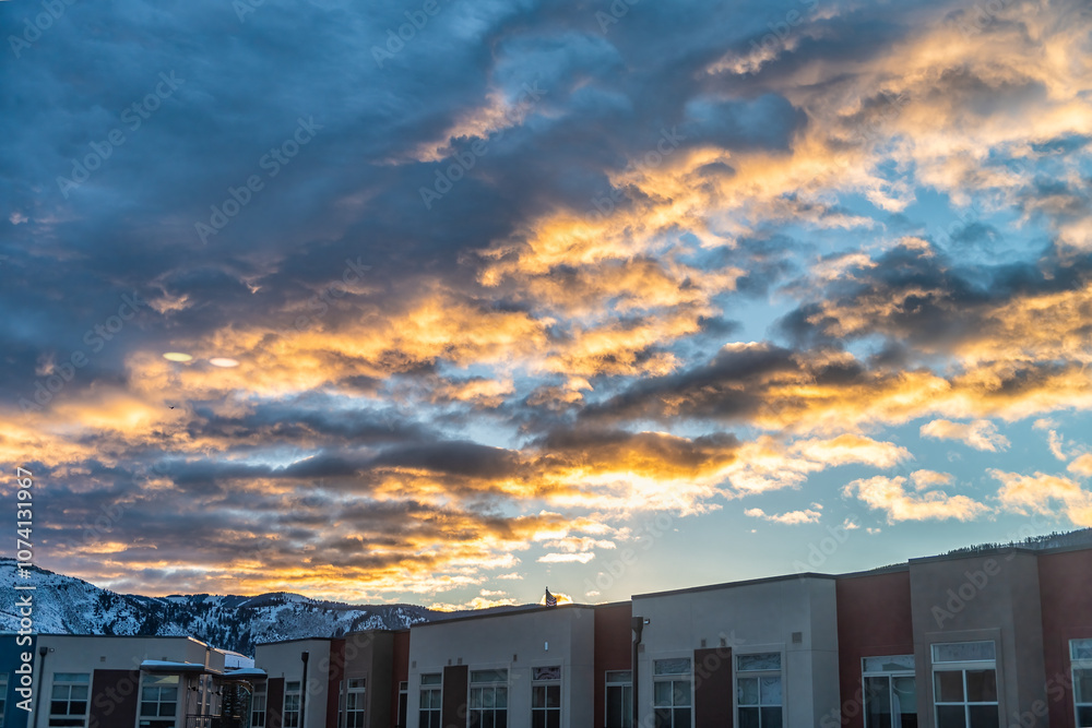 Avon, Colorado small town Mountain Village in winter snow view of Rocky Mountains and modern apartment condo architecture by Vail