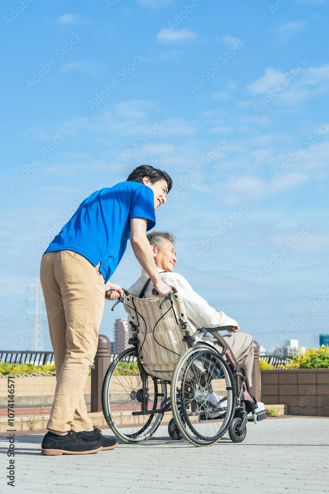 介護、車椅子、シニア、散歩、介護士、外出、ヘルパー、高齢者、お年寄り、街、笑顔、都市、社会、ウェルネス、福祉、ケアスタッフ、スタッフ、介助、老後、介護福祉士、橋、道路、歩道、バリアフリー、障害者、ホームヘルパー、屋外、サービス、サポート、訪問、リハビリ、ヘルスケア、老人ホーム、青空、見上げる、希望、ポジティブ、デイサービス、元気、明るい、励ます、応援、フレイル、サルコペニア、ボランティア、背中、後