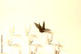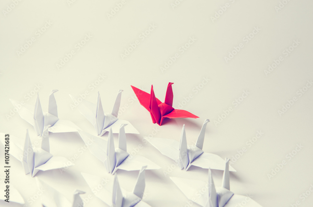 Close up red bird leading among white, Leadership concept, retro filter, copy space.