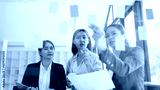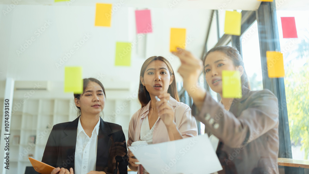 Asian businesswoman teamwork planning with sticky notes and new ideas on a glass wall, Business people brainstorming strategy and new ideas concept, startup worker meeting,