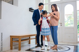 Family Asian mother helping her primary daughter put bag backpack and get dressed in front of home before go to school, with the father dressed in a suit standing and waiting to be dropped off