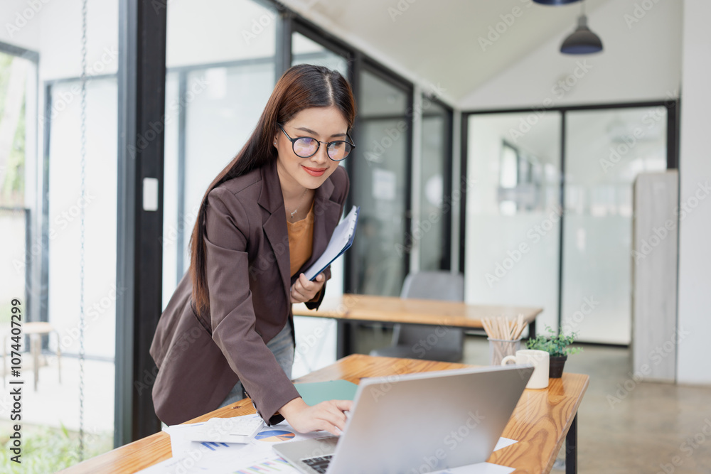 Asian businesswoman working on laptop with finances analysis report at desk in office, business financing, accounting banking,