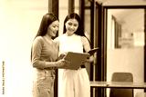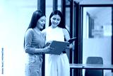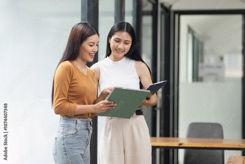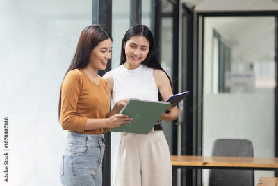Two Asian business female talking together with partner standing in office.