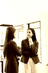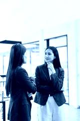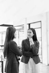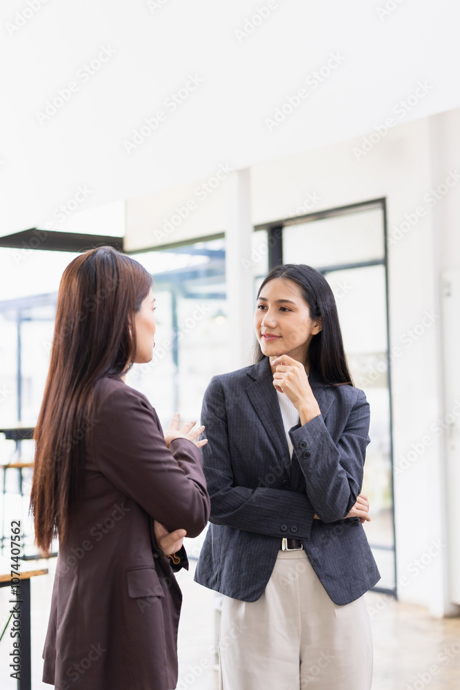 Two Asian business female talking together with partner standing in office.