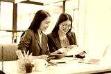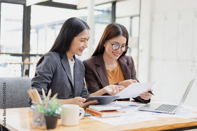 Two businesswoman working with analysis data investment plan, Business startup and marketing presentation,
