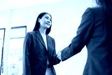 Two young Asian female making handshake inside at office workplace, partner, greeting, businesswomen handshake.