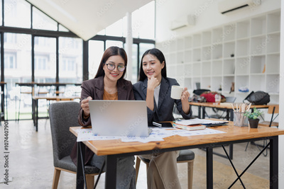 Two businesswoman working with analysis data investment plan, Business startup and marketing presentation,
