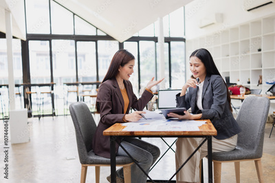Two businesswoman working with analysis data investment plan, Business startup and marketing presentation,