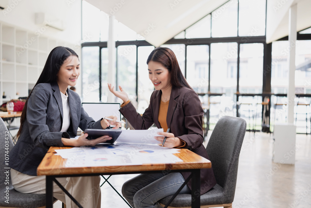 Two businesswoman working with analysis data investment plan, Business startup and marketing presentation,