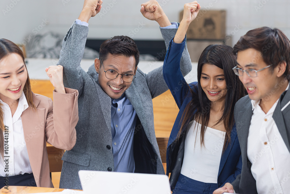 Business team celebrating success, Excited business team celebrating success in office, About successful startup projects concept.