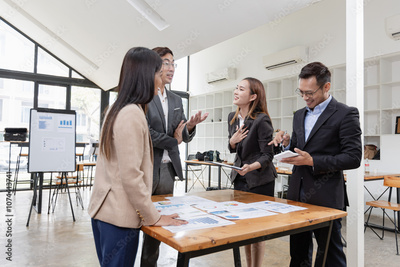 Asian business teamwork working with analysis report and advisor showing plan, Financial analysis and Marketing teamwork concept.