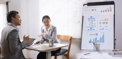 Two business people working with business financing accounting banking and laptop with finances analysis report at desk in office.