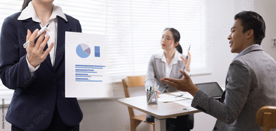 Asian business teamwork working on digital tablet with analysis report and advisor showing plan, Financial analysis and Marketing teamwork concept.