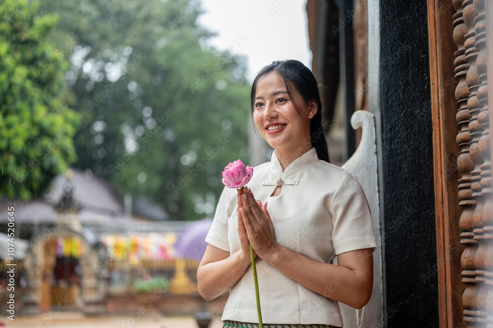 An Asian woman in a traditional dress stands in a temple, holding a lotus in a prayer posture.