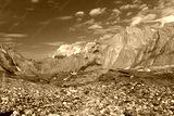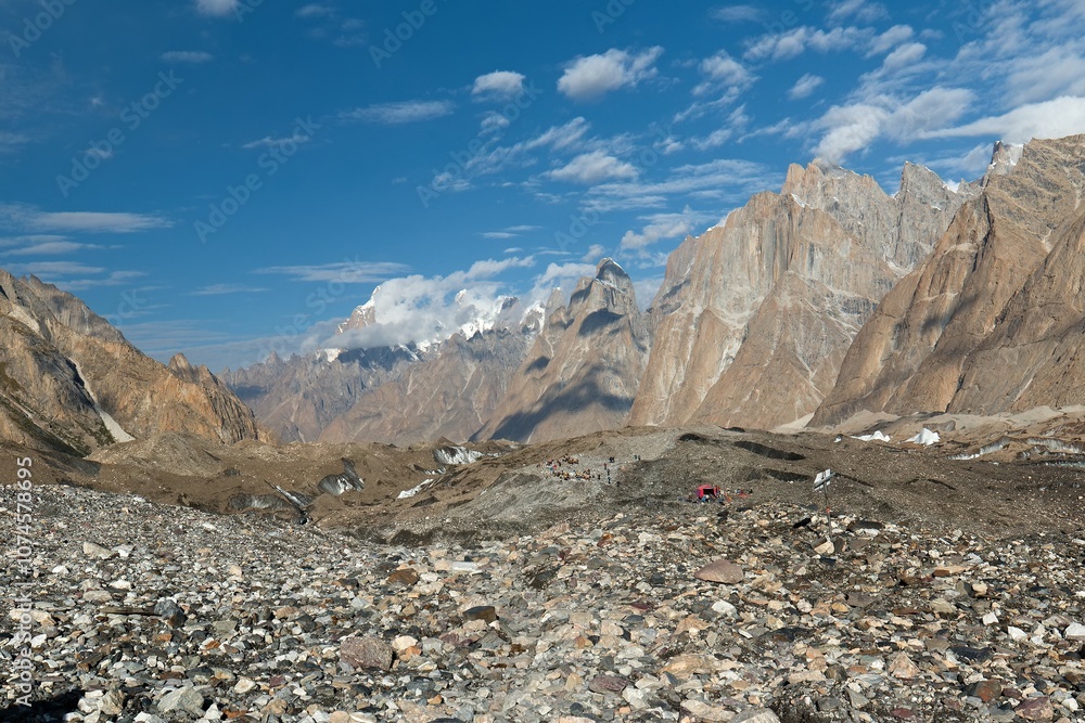 View from Baltoro glacier near Gore 1 campsite at Trango Towers. Karakoram Mountains. Gilgit-Baltistan region. Pakistan. Asia.
