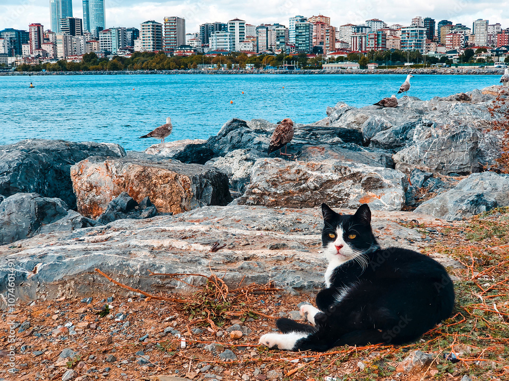 A black and white cat lies on the rocks against the backdrop of a sea of seagulls, a city and houses