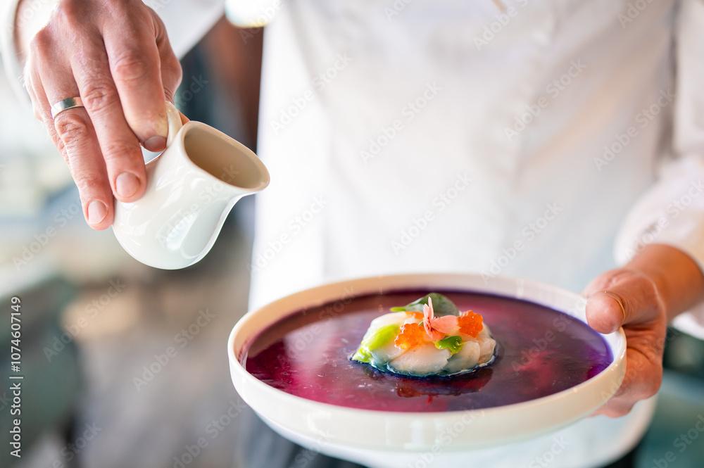 A chef elegantly pours sauce over a gourmet dish, showcasing vibrant colors and fine dining presentation. The image captures the artistry and precision of culinary craftsmanship in restaurant setting.
