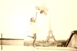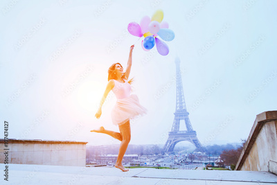 dream travel, girl with balloons jumping near Eiffel Tower in Paris