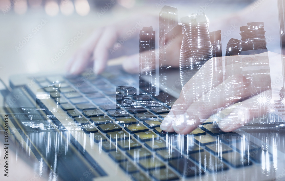 modern technologies, double exposure background of hands with computer keyboard and night city skyline